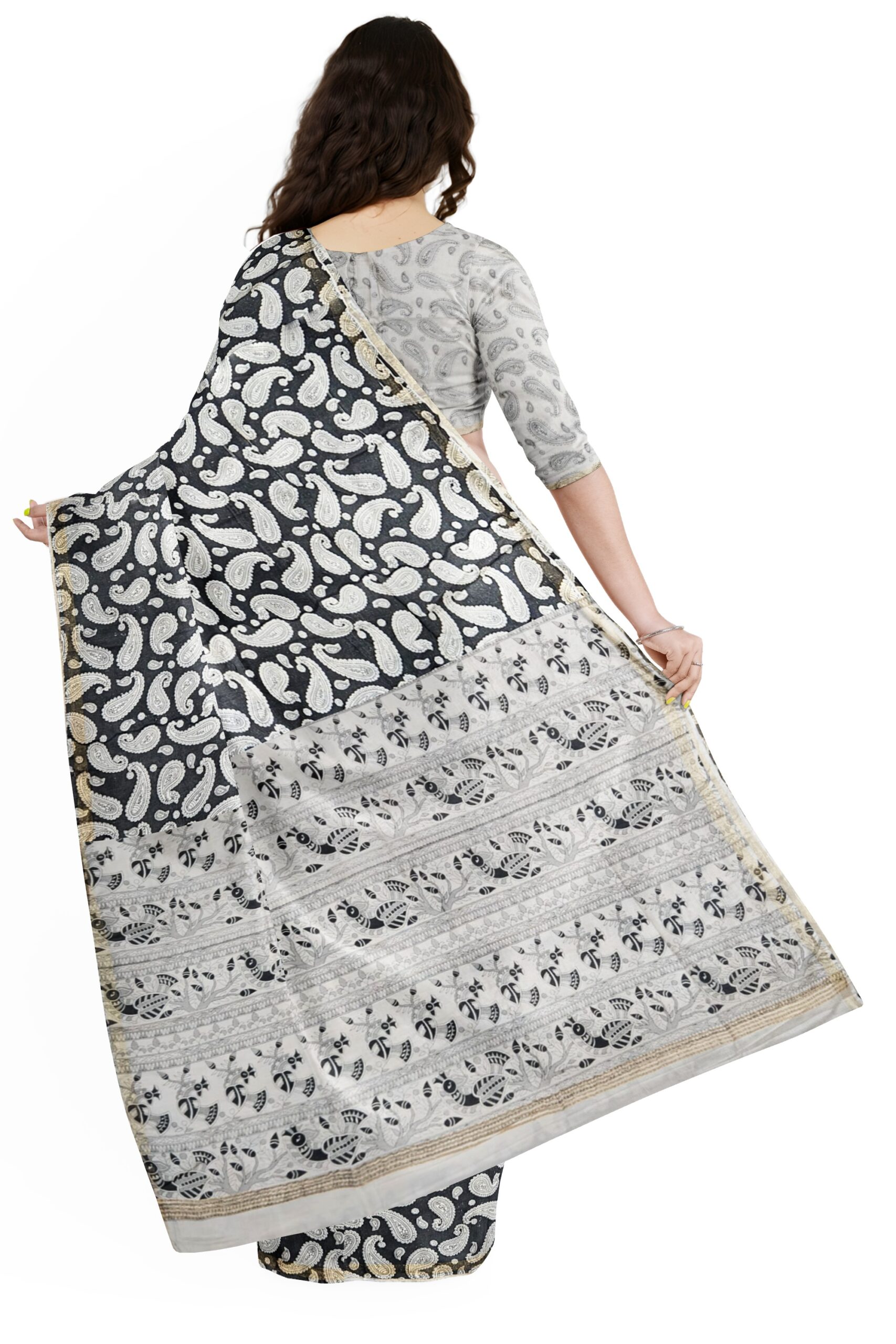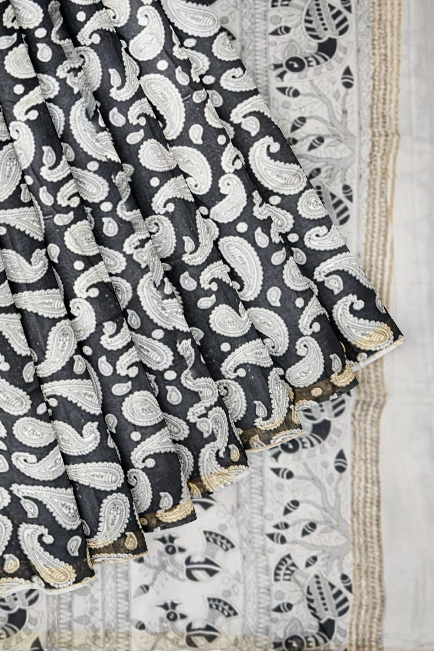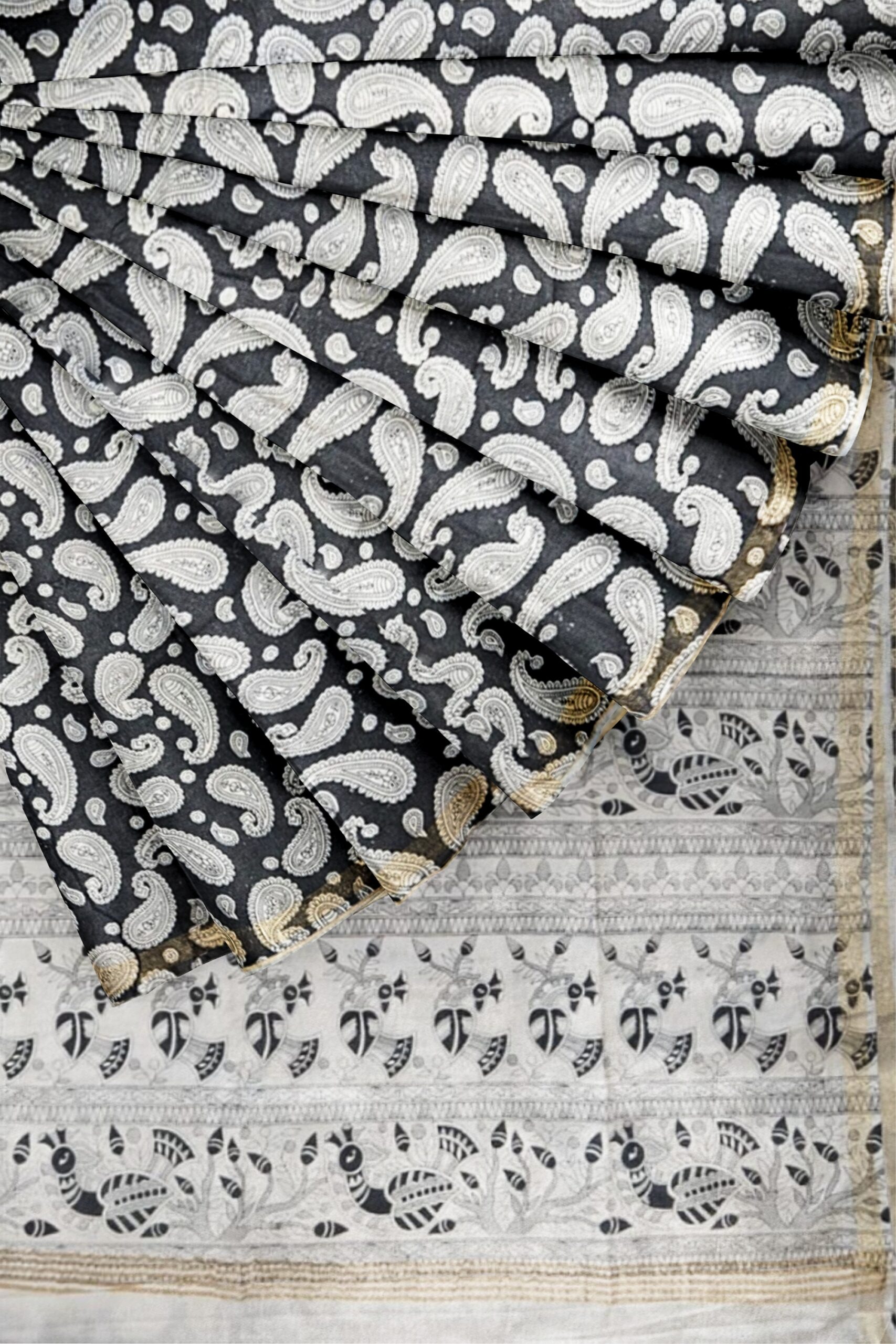 Black and White Cotton Saree with Paisley and Tribal Pallu Design – Tussar Muga Sarees