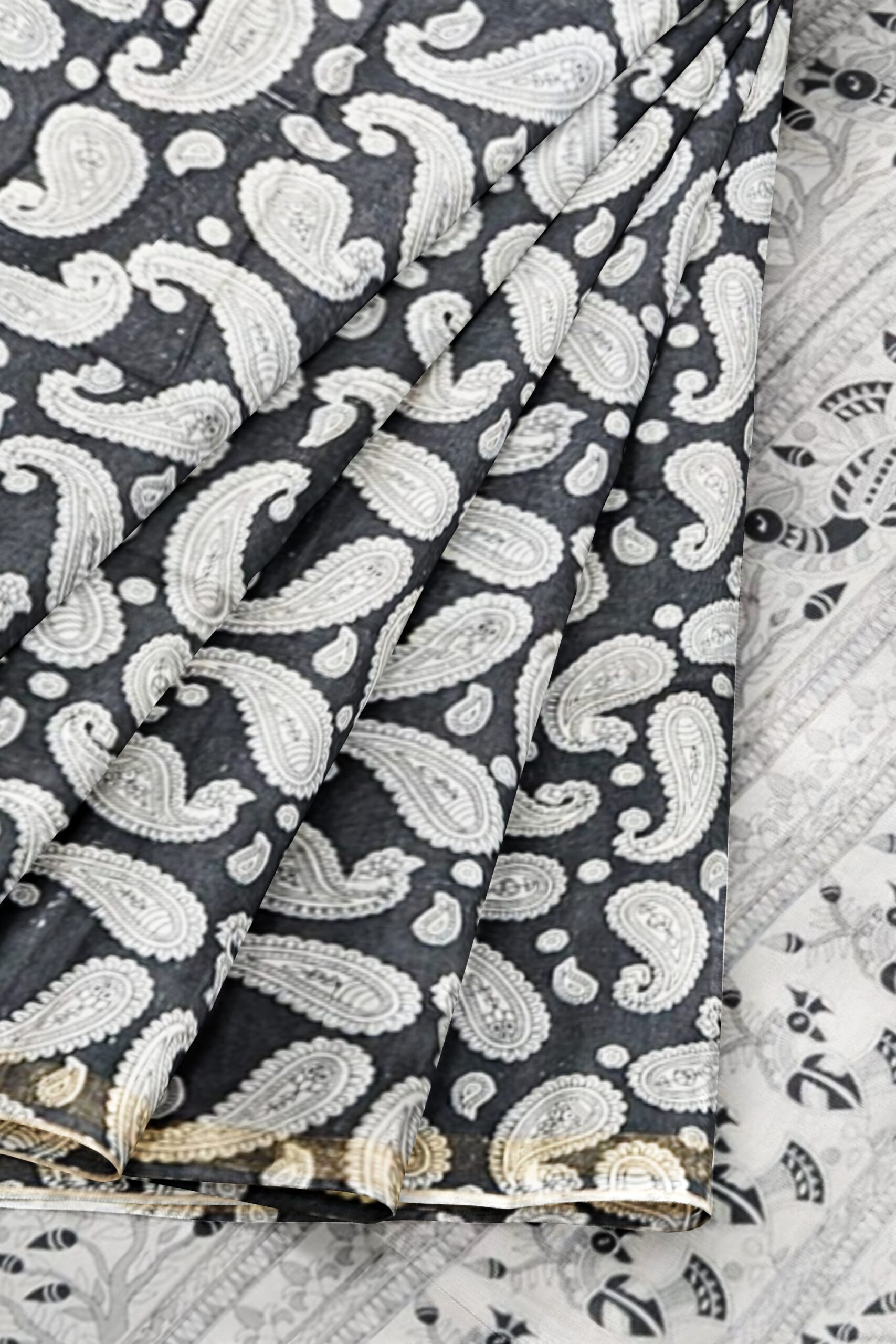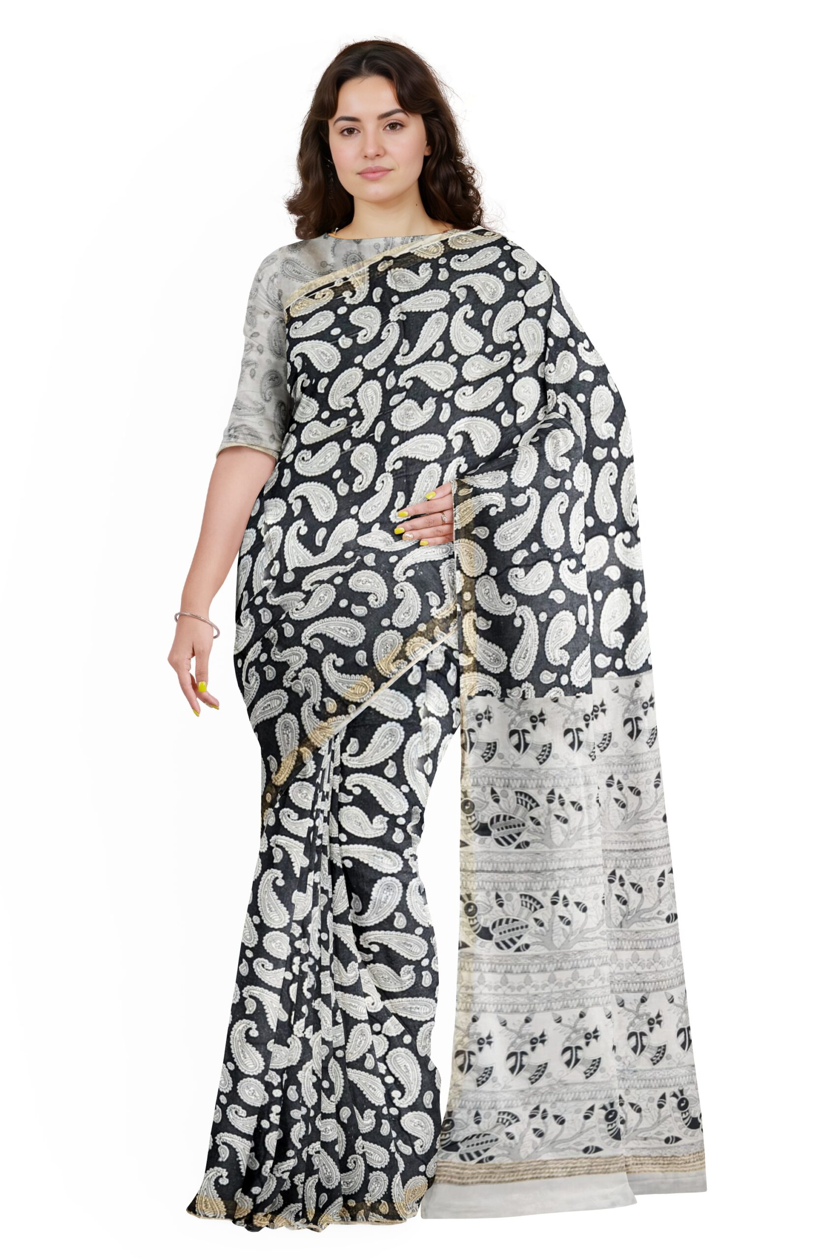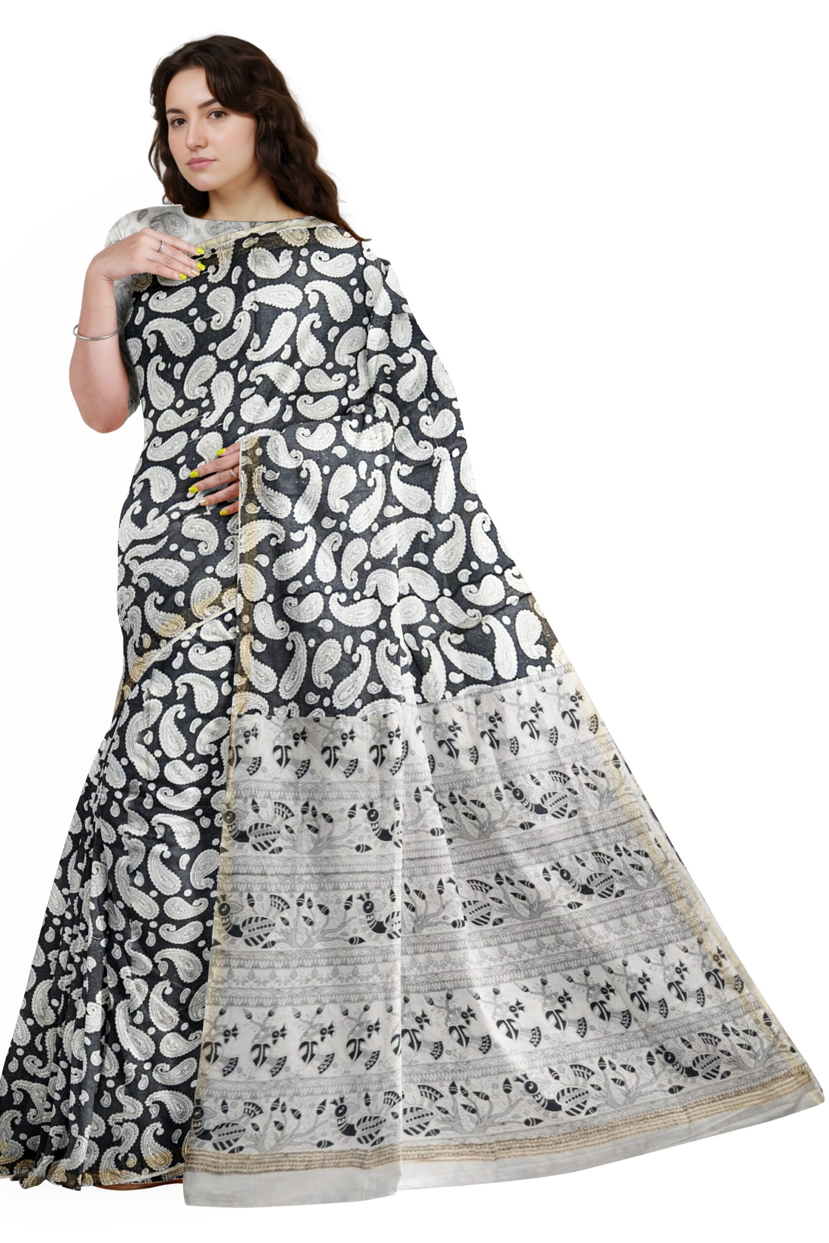 Black and White Cotton Saree with Paisley and Tribal Pallu Design – Tussar Muga Sarees