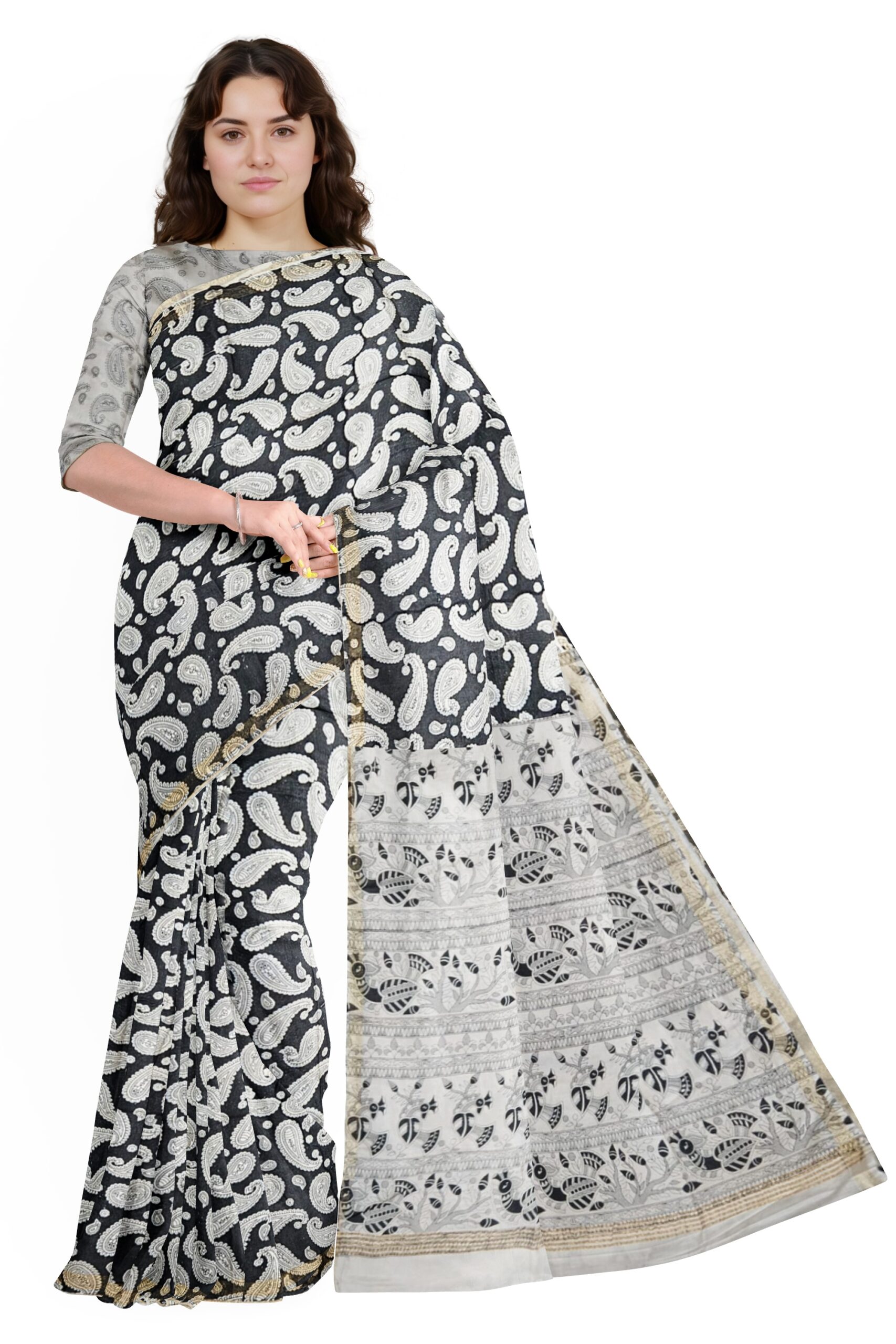 Make a sophisticated statement with this beautiful black and white cotton saree. The body of the saree is adorned with delicate white paisley motifs that reflect traditional Indian design. The pallu offers a graceful contrast with intricate tribal-style patterns in black on a white base, adding a contemporary twist to the ethnic appeal. Finished with a subtle golden border, this saree is perfect for day functions, office wear, or casual gatherings. The breathable cotton fabric ensures comfort and easy drape throughout the day.