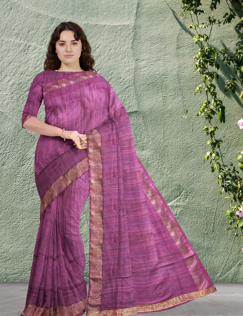 Graceful purple cotton silk saree featuring a soft gold zari border — perfect for office wear, small celebrations, or traditional elegance.