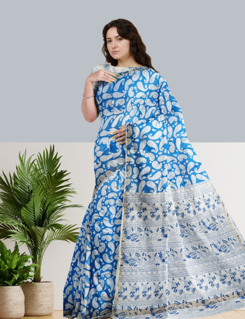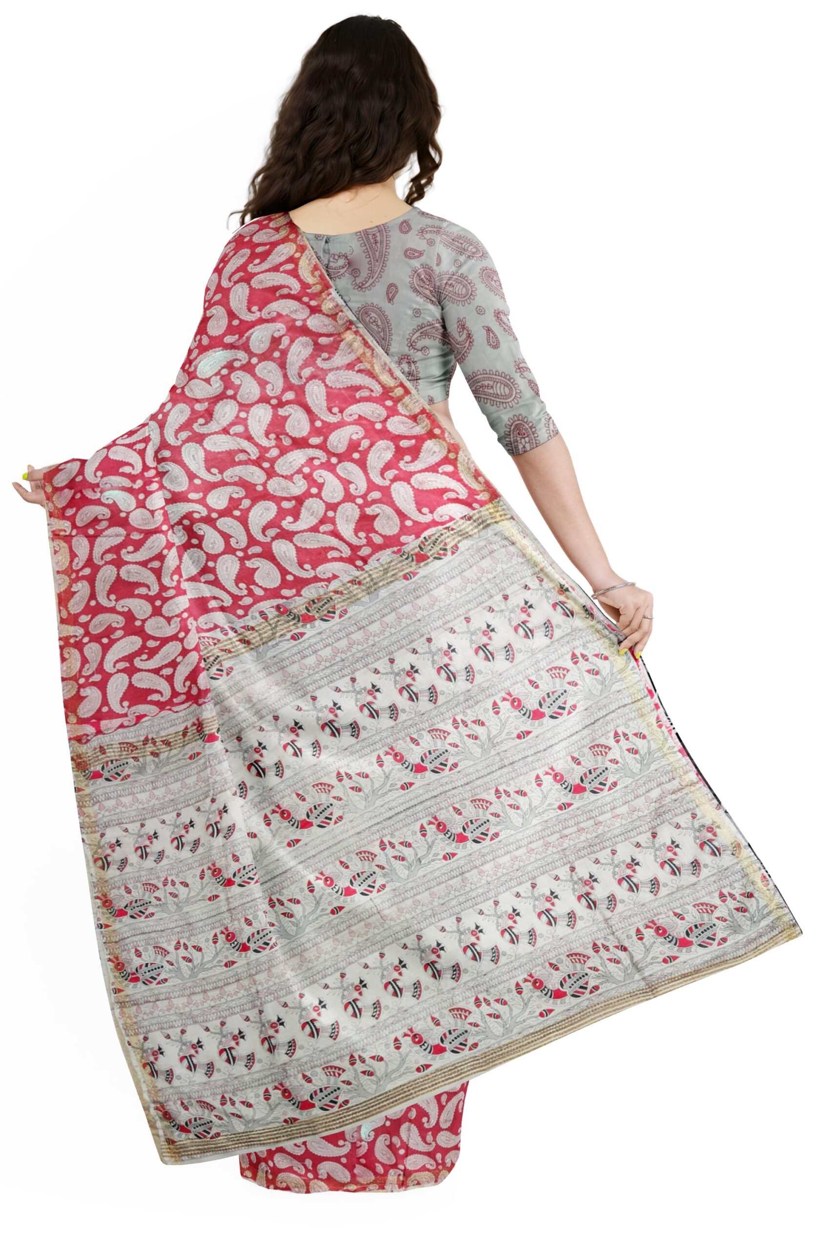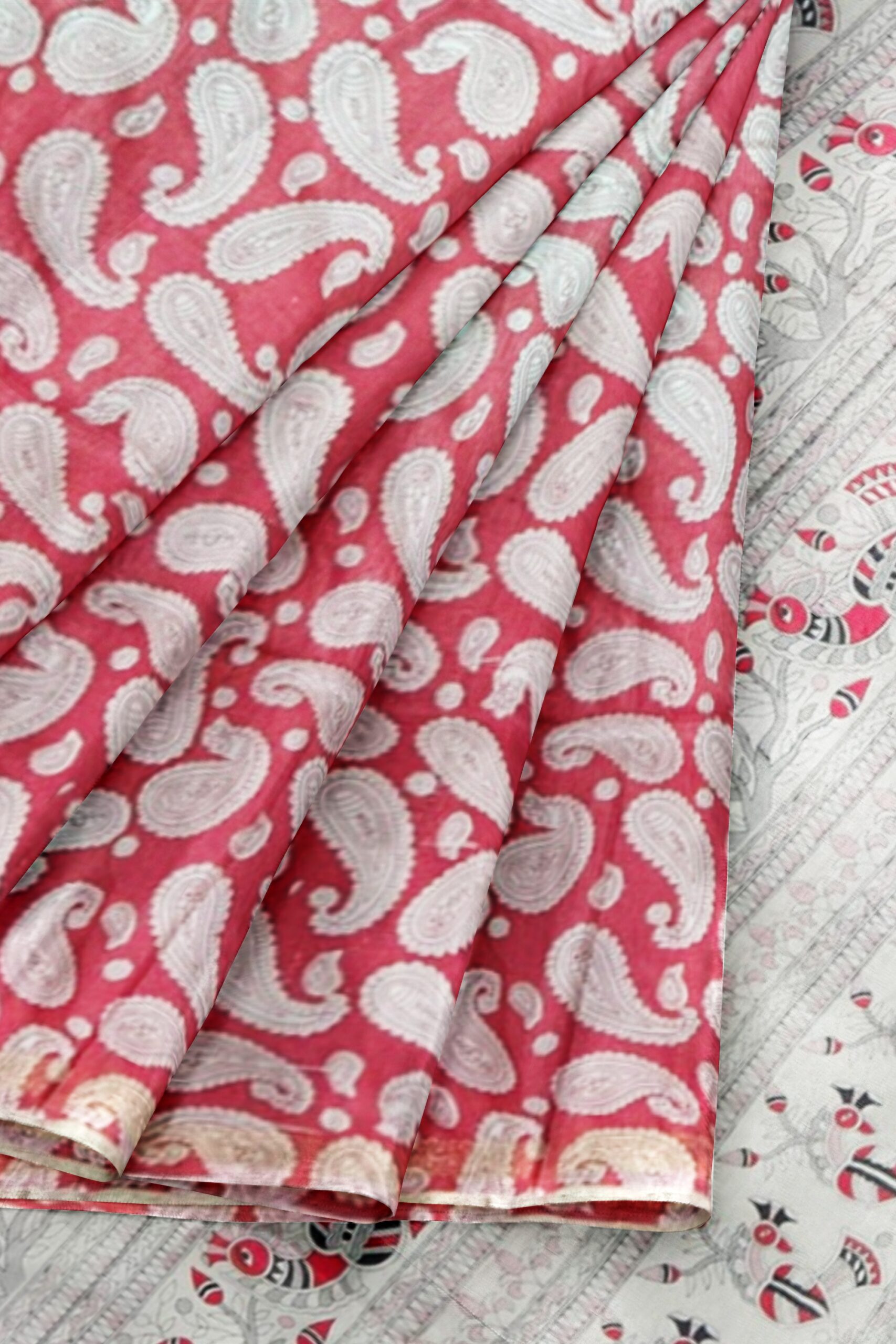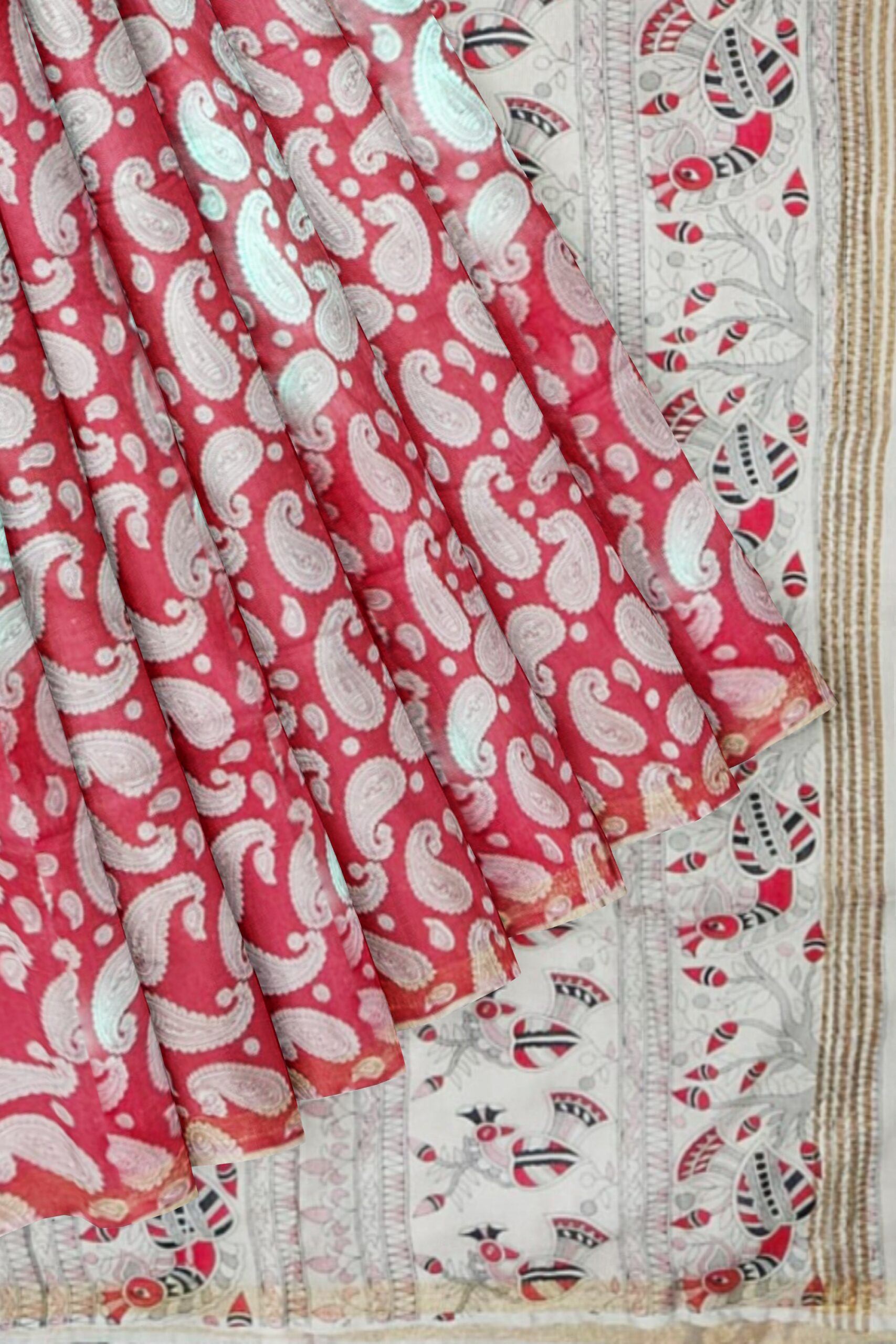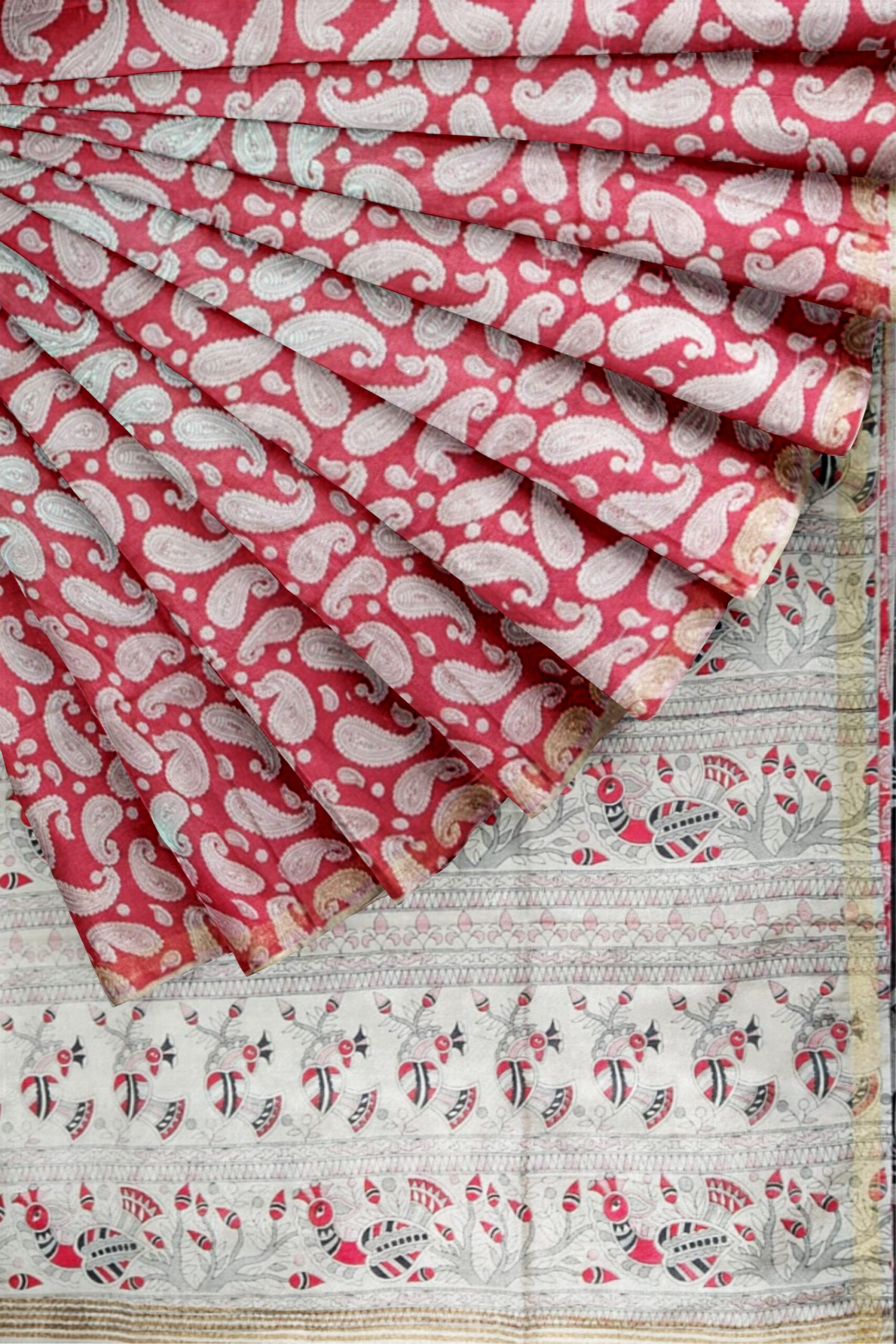 Red and White Cotton Saree with Paisley Print and Ethnic Pallu – Tussar Muga Sarees
