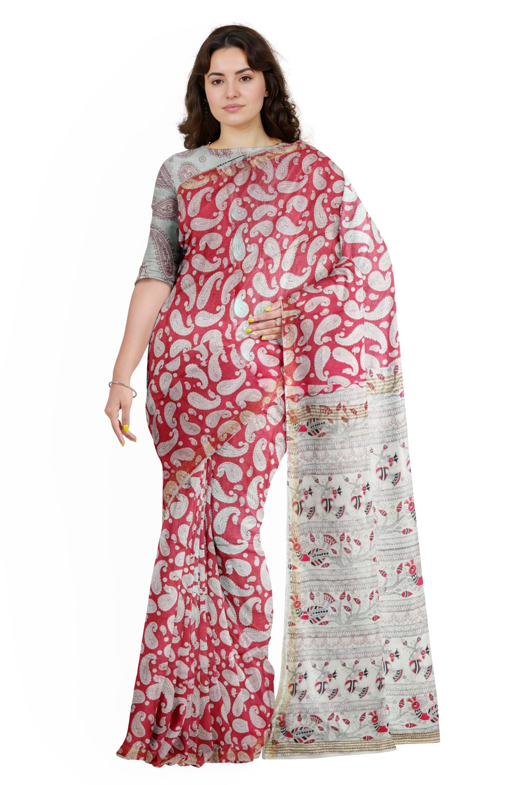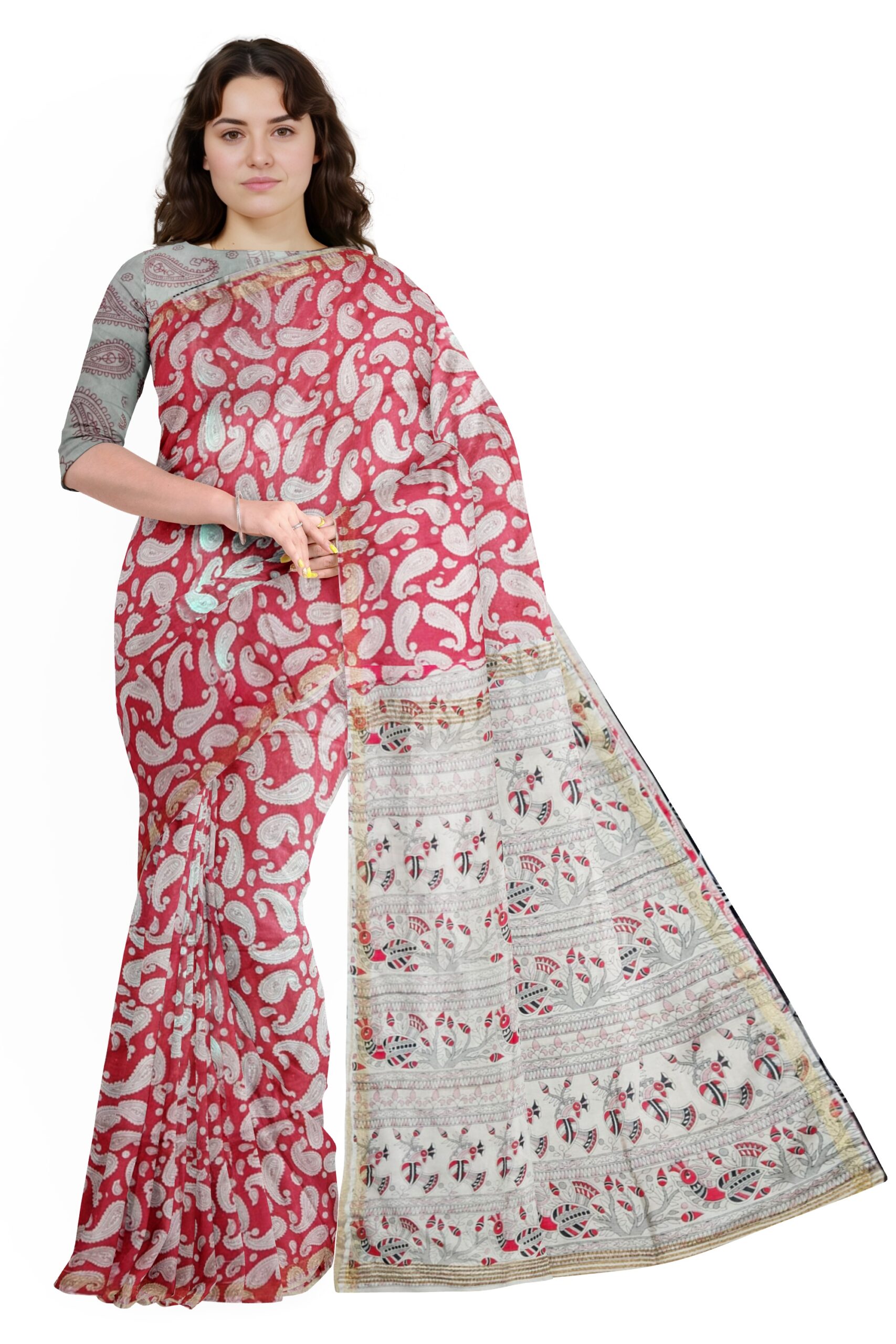 Add a splash of elegance to your ethnic collection with this graceful red and white cotton saree. The rich red body is adorned with traditional white paisley motifs, giving it a timeless and graceful appearance. What sets this saree apart is its contrasting pallu — a serene white canvas detailed with vibrant red, black, and green tribal-inspired patterns and horizontal bands. Accented with a subtle golden border, this saree is light, breathable, and comfortable for all-day wear. Perfect for festive gatherings, cultural events, or smart casual outings.